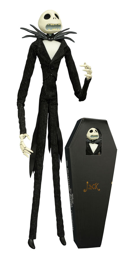 Jack is back! The original, limited-edition Jack Skellington Coffin Doll is sold out, but this new version of the Nightmare Before Christmas star brings him back to the stores with a new facial expression, a new coffin, and the same real clothes and poseable skeleton body! Measuring approximately 16 inches tall, this doll looks like it just stepped off the big screen – and into a coffin! Packaged in a quality cardstock coffin, this doll includes a display stand. SRP: $49.99