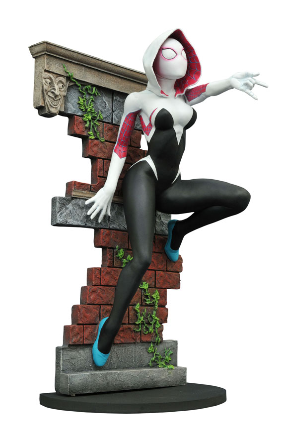One of the most exciting new characters in the Marvel Universe is now part of one of its most exciting new collectible lines! The Amazing Spider-Gwen, a spider-powered, hard-rocking Gwen Stacy from a parallel universe, gets the Gallery treatment with this 9-inch scale static PVC figure! Posed on the side of a New York brownstone, Spider-Gwen is sculpted with a high level of detail and exacting paint applications. Packaged in a full-color window box, she is in scale to other Gallery and Femme Fatales PVC figures. Sculpted by Jean St. Jean! SRP: $45.00