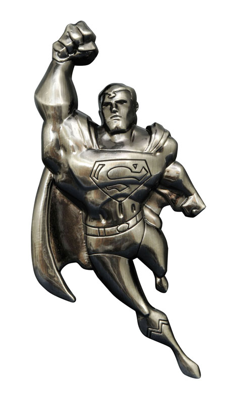 Faster than a speeding bullet! More powerful than a locomotive! Able to remove a bottlecap in a single bound! Draw on the strength of the Man of Steel with this solid metal bottle opener in the shape of the Superman himself, as he appeared in Superman: The Animated Series! Like Superman himself, this 4" opener can bend metal and remove bottlecaps with ease, and two magnets on the back allow it to float on your refrigerator until it's time to swoop in and save the day! Packaged in a full-color slipcase. SRP: $18.00