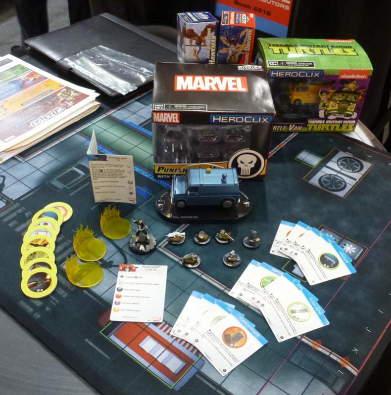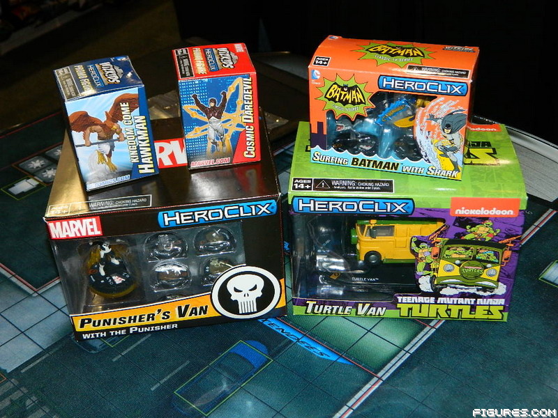 For our exclusive reveal we got to see some of this year’s Convention Exclusives! The lineup we showed off first include single figure packs of DC’s Kingdom Come Hawkman and Marvel’s Cosmic Daredevil. Then they get crazy starting with the TMNT Turtle Van vehicle! On the DC side a bigger pack takes us back to ’66 with Surfing Batman with Shark. You’ll be able to play Batman on his own... or play him at a lower point value but your opponent gets to play the shark! And separate from that the surfboard is a removable 3D object and the shark can be played on its own... and it has the Atlantis keyword. Lastly, the Marvel HeroClix Punisher's Van set gives you the vigilante and his vehicle that can provide him with a cache of weapons and equipment. There are three flame FX bases, six 3D objects, and eight object tokens that all interact with the Van’s Weapons Dial. NOTE: All packaging and materials are mock ups at this point.