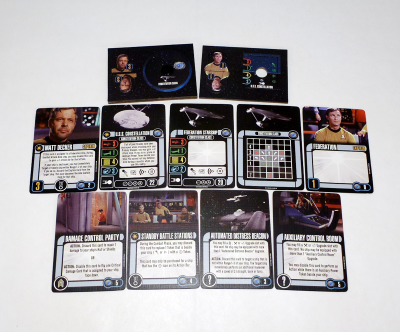 The Constellation comes with a standard 1 Skill Federation Captain and the 2 cost 3 Skill Captain Matt Decker who adds an Elite Upgrade slot. He has two special abilities: when he’s on a Federation ship you can disable him to get +1 attack die during the Roll Attack Dice step, and when his ship is destroyed you can transfer him to replace the captain on another ship within Range 2! The 5 point Damage Control Party Crew Upgrade has two Action options: discard to repair 1 Hull or Shield or disable to flip one Critical Damage Card face down. The Elite Talent Standby Battle Stations costs 4 points and can only be purchased for a ship with Battle Stations; during the Combat Phase you can discard it to replace an Evade or Scan token next to your ship with a Battle Stations token. Finally there are two Upgrades that can fill variable slots and are limited to one per ship. Automated Distress Beacon costs 3 points, fills either a Crew, Tech, or Weapon slot and when it’s discarded as an Action a ship of your choice outside Range 3 immediately performs an additional 2 speed maneuver. Lastly the 5 point Auxiliary Control Room serves as a Tech or Weapon Upgrade and you can disable it to perform an action while your ship has an Auxiliary Power Token! The U.S.S. Constellation pack also includes the requisite double-sided Ship Token, Captain ID Tokens, 1 Shield Token, and 1 Effect Token.