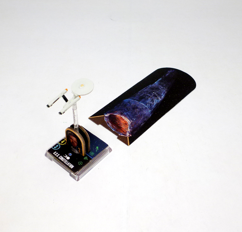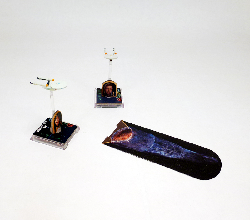 So how does the Doomsday Episode translate into a Star Trek Attack Wing game? The included Overview pamphlet has all the rules and instructions. An in-universe briefing sets the stage, describing your investigation into destroyed planets and a subsequent battle when you come across another faction doing the same thing. But, then the planet-killer arrives and attacks everyone! To play this scenario you’ll use the standard set up with one player on either side of the map. The Doomsday Machine token, a 5 inch long token representing the distinctive spacefaring device from the show, is centered along the East border of the battlefield, and each player takes turns placing two Objective Tokens (at least Range 1 from edges and further than Range 3 from any other tokens). During the game the Objective Tokens will act as Obstacles and if at any point the Doomsday Machine overlaps one the Objective is removed and the Machine repairs 2 damage! The planet-killer is a fearsome opponent with Primary Weapon 8, Agility 0, Hull 10, and Shields 0. Each turn after all other ships have moved the Doomsday Machine targets the nearest ship in range and moves toward it, maneuvered by the player opposing the targeted ship. The Machine has a host of special abilities including ignoring critical damage, only taking damage when hit on its front edge (the exposed “mouth”), and self-healing each End Phase. It attacks last in the Combat Phase, with the player opposing the targeted ship rolling its dice. This scenario ends when one player is eliminated or the time limit is reached, and a player that destroyed the Doomsday Machine gets a huge bonus of +20 Fleet Points!