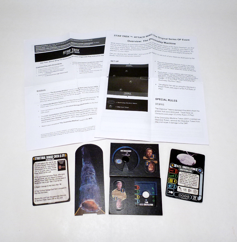 Like previous Star Trek Attack Wing Organized Play kits, the Doomsday Machine replicates events from the episode as a scenario for tournament play including specific terrain and special tokens as well as themed prizes for the winners. Each kit includes an Instruction/Score Sheet for the organizer, an Overview Sheet, 5 Map Element sets (good for 5 games/10 players in an event), 10 Structural Damage Check Cards for participation prizes, and 3 U.S.S. Constellation/Constitution-class prize kits with a maneuver dial, tokens, Ship, Maneuver, Captain, and Upgrade Cards. Note that this prize kit does not include a physical ship, but one of the great things about this game is that you can re-purpose models for different factions, named ships, etc. So, whether you have the original U.S.S. Enterprise from Wave 0, the Mirror Universe I.S.S. Enterprise, or the U.S.S. Intrepid you can use the ship you already have plus the materials in this kit to field the Constellation or a Federation Constitution-class vessel.