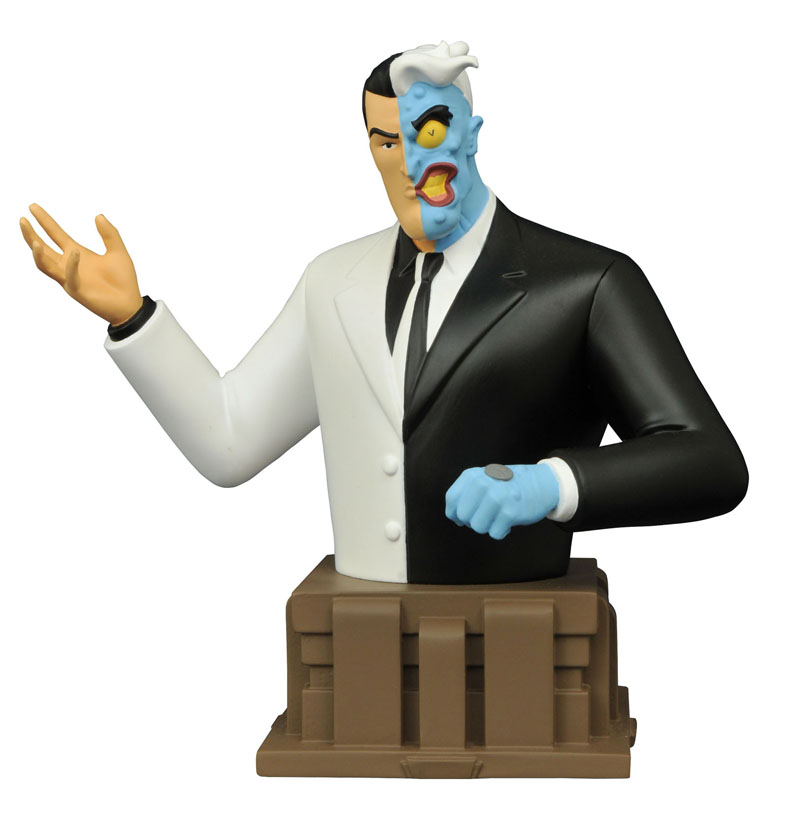 You won't have to flip a coin to decide whether or not you need this bust! Joining DST's line of resin busts based on Batman: The Animated Series, heavily scarred lawyer-turned-gangster Harvey Dent has been captured just as he appeared in the classic cartoon. Posed atop an art-deco base, this approximately 6" resin sculpture of Two-Face comes with a certificate of authenticity, inside a full color box. Limited to 3,000 pieces! Sculpted by Varner Studios. (Item #OCT152189, SRP: $59.99)