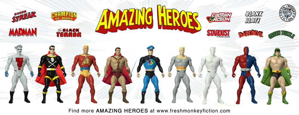 Amazing Heroes, the retro 4.5” action figure line by Fresh Monkey Fiction, debuts at WonderCon 2016 from March 25th to 27th in Los Angeles. The Wave 1 lineup includes licensed characters Madman (by Michael Allred) and the classic Captain Action - both in this scale for the first time. Other Wave 1 figures include vintage heroes Black Terror, the Golden Age Daredevil, Stardust, and Green Turtle. Each figure features optional backer cards with Golden Age comic book art, or new card art from some of the comic book industry's top talent--such as Erik Larsen, Phil Hester, Reilly Brown, Michael Allred, and Sonny Liew.