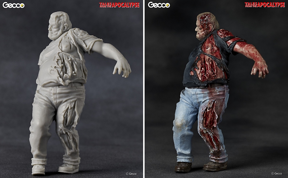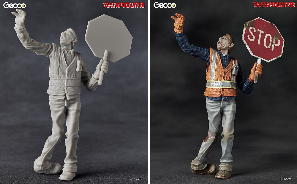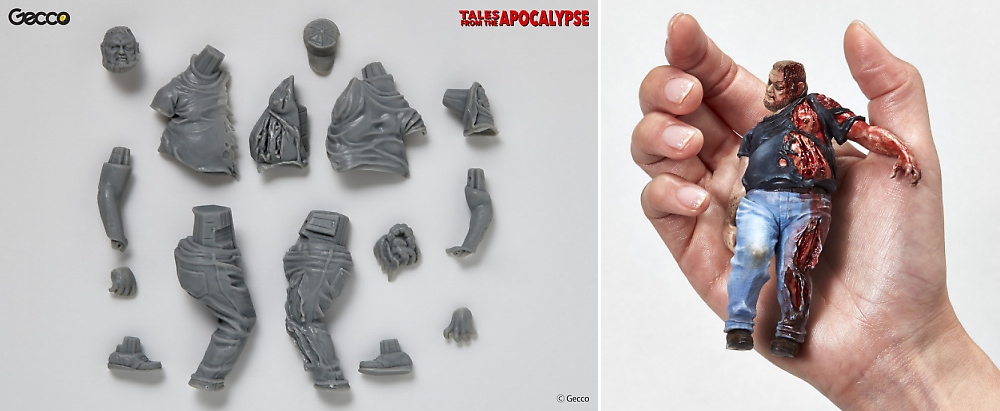 Gecco presents Tales from the Apocalypse, a new series of 1/16th scale Zombie plastic model kits. The premise of the line is styled after an old horror movie, the first wave of model kits capturing characters from a key moment in the make-believe movie: "Scene 1: Day 1, 11:50 am on Freeway". Even the packaging for each model kit is brilliantly designed to appear as a VHS tape box!