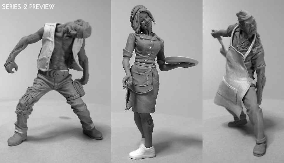 Slated for release this May priced at $24.99 each, series 1 stars the Heroine, the kit capturing the moment when she awakes surrounded by zombies. The undead in this wave include The Truck Driver and The Traffic Guard. As the story goes on, various zombies having different stages of decay will appear (see the series 2 preview below).