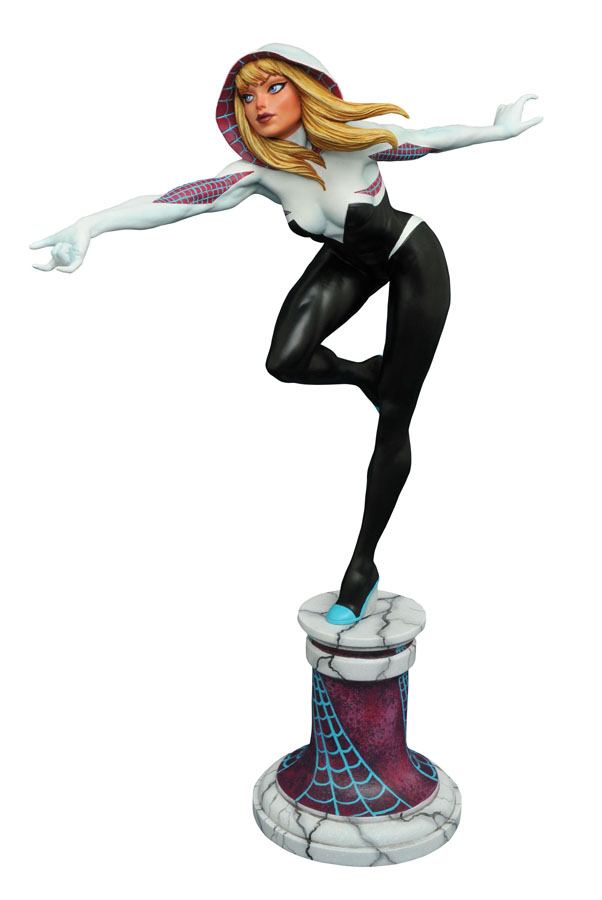 The Spider-Woman of Earth-65 is taking the Marvel Universe by storm, whether she’s fighting alongside other spider-heroes against the Inheritors, or playing with the Mary Janes in a battle of the bands! This 12-inch scale statue of the unmasked “Spider-Gwen” shows her alighting on a pillar, preparing to shoot a webline while balanced on one foot. Sculpted by Clayburn Moore, this resin statue is limited to an edition of 3,000 pieces, and comes packaged with a certificate of authenticity in a full-color window box. (Item #APR162612, SRP: $150.00)