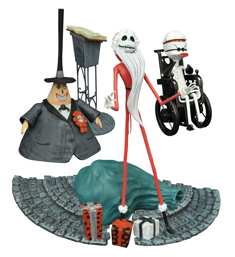 One of the hottest toy lines of 2015 returns for another series! Picking up where Series 1 left off, Series 2 of Nightmare Before Christmas Select action figures features Santa Jack, the Mayor and Dr. Finkelstein, each in an approximately 7-inch scale. Dr. Finkelstein includes a rolling wheelchair, and Santa Jack comes with his sack of presents. Each figure also includes a piece of a courtyard diorama – collect all five pieces to build the courtyard and fountain! Each figure features multiple points of articulation, and comes packaged in display-ready Select packaging, with side panel artwork. Sculpted by Dave Cortes!