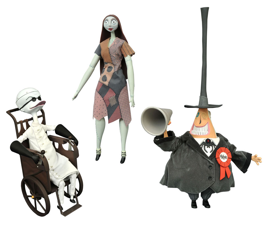 Expand your Halloween Town doll display with three new releases in the Nightmare Before Christmas Collection! Ranging in height from 9 to 14”, these detailed, articulated dolls each feature real fabric costumes and look as if they just stepped off of the big screen. The 14-inch tall doll of Sally the Rag Doll features a new head sculpt and comes in a coffin-shaped window box. The Mayor of Halloween Town measures 12 inches tall (with hat), has a rotating head to display both of his facial expressions, and comes with an interchangeable megaphone-holding hand. Sally’s creator Dr. Finkelstein measures approximately 9 inches tall, sits in a wheelchair with rolling wheels, and has an opening head and removable brains! The Mayor and Dr. Finkelstein are packaged in full-color window boxes. Sally comes in a coffin box. The perfect gifts for any Halloween lover!