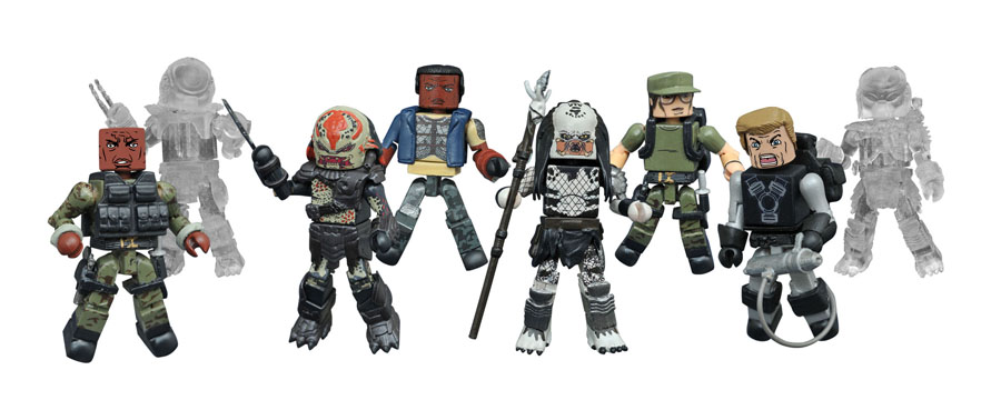 The hunt continues! The new assortment of 18 foil-bagged Predator Minimates features eight different characters from Predator, Predator 2 and Predators -- Berserker Predator, Shaman Predator, Cloaked Jungle Predator, Cloaked City Predator, Keyes, Mac, Noland and the rare, one-per-case Hawkins! Each 2-inch Minimates mini-figure features up to 14 points of articulation as well as fully interchangeable parts and accessories. Each Minimate is packaged in a sealed foil bag, in a space-saving countertop display featuring full-color artwork on all sides. (Item #APR162618, SRP: $5.99/ea.)