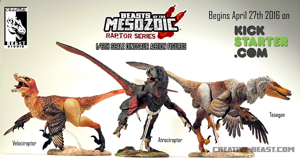 This first series of Beasts of the Mesozoic will be the 1/6th scale Raptor Series consisting of mid-sized dromaeosaurs and related species. The campaign is currently underway with three species to choose from, each priced at $35 or $100 for all three. Raptors include Velociraptor, Atrociraptor, and Tsaagan with more to follow as the campaign progresses. (A Kickstarter exclusive figure will be added the second week of the campaign). Each figure will have 26 points of articulation, realistic detail and movement based on the most recent scientific discoveries, and will also feature a base with posing rod as well as alternate running toes.