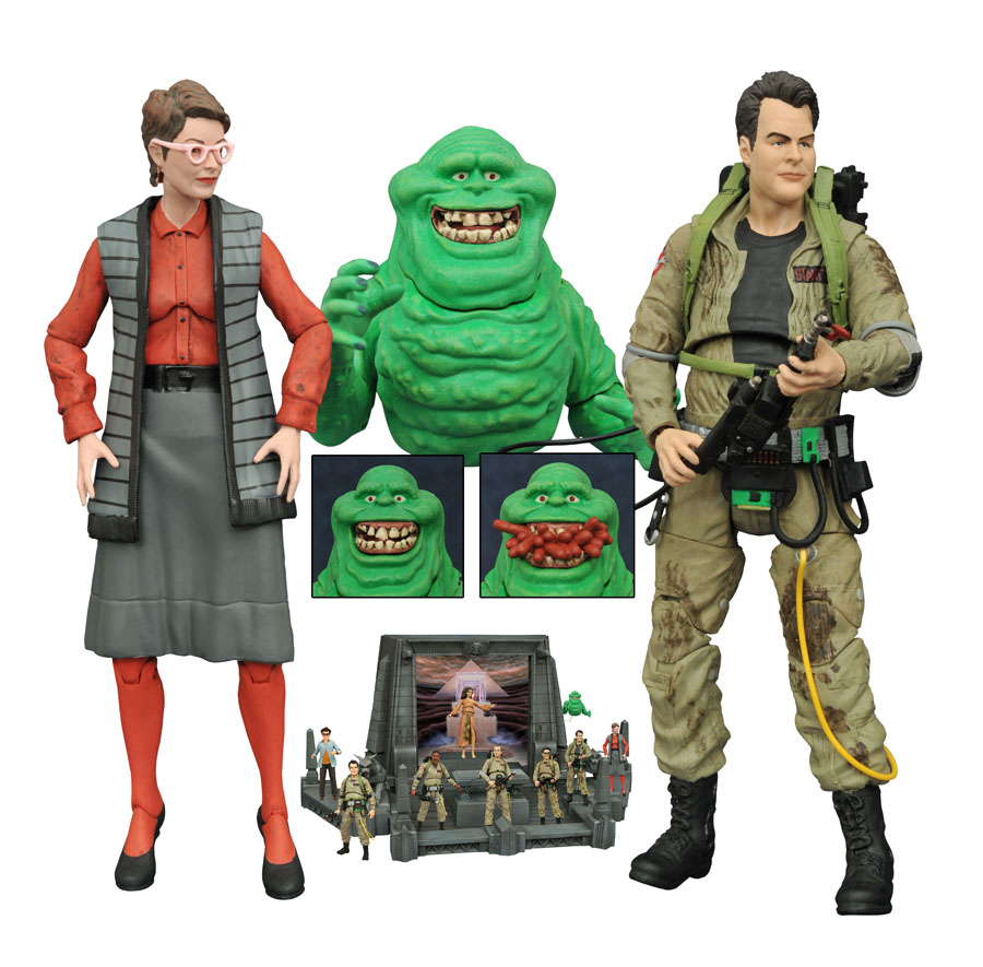 DST's Ghostbusters Select action figure series continues with three new figures, and three more pieces of the colossal rooftop diorama! Slimer, Janine and Quittin’ Time Ray make up Series 3, and each comes with bonus accessories in addition to their diorama piece: Janine includes a phone, alarm button and take-out containers; Slimer comes with two alternate faces and a support stand that can plug into the rooftop; and Quittin’ Time Ray includes a variety of interchangeable gloved and ungloved hands, as well as all-new sculpting and paint details to reflect his appearance at the end of a long shift. Each 7-inch scale action figure features up to 16 points of articulation, and comes packaged in display-ready Select figure packaging. Collecting all 15 figures in the series allows you to build the full rooftop temple scene from Ghostbusters! Series 1 and 2 available now! Sculpted by Gentle Giant! (Item #MAY162380, SRP: $24.99/ea)