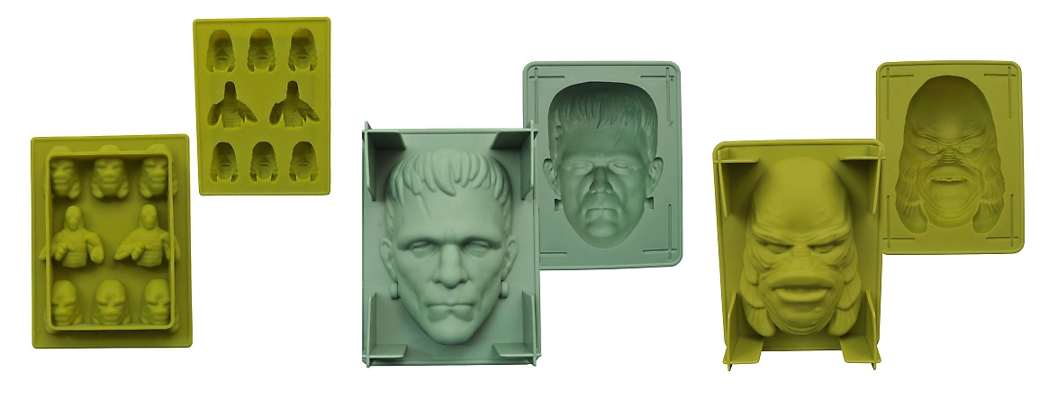 A Diamond Select Toys release! Throw a party that’s frightfully good with these two gelatin molds and one silicone tray in the shape of the classic Universal Monsters! One 10” plastic gelatin mold allows you to cast up the head of Frankenstein’s Monster in delicious gelatin, while a second mold captures the scaly features of the Creature from the Black Lagoon! Plus, a 7” by 5” silicone tray lets you fill up eight separate compartments with ice, chocolate or gelatin, and what comes out is in the shape of the always-popular Creature! Liven up your next Halloween party, or any celebration where classic horror fans can be found! Each comes packaged in a full-color window box.