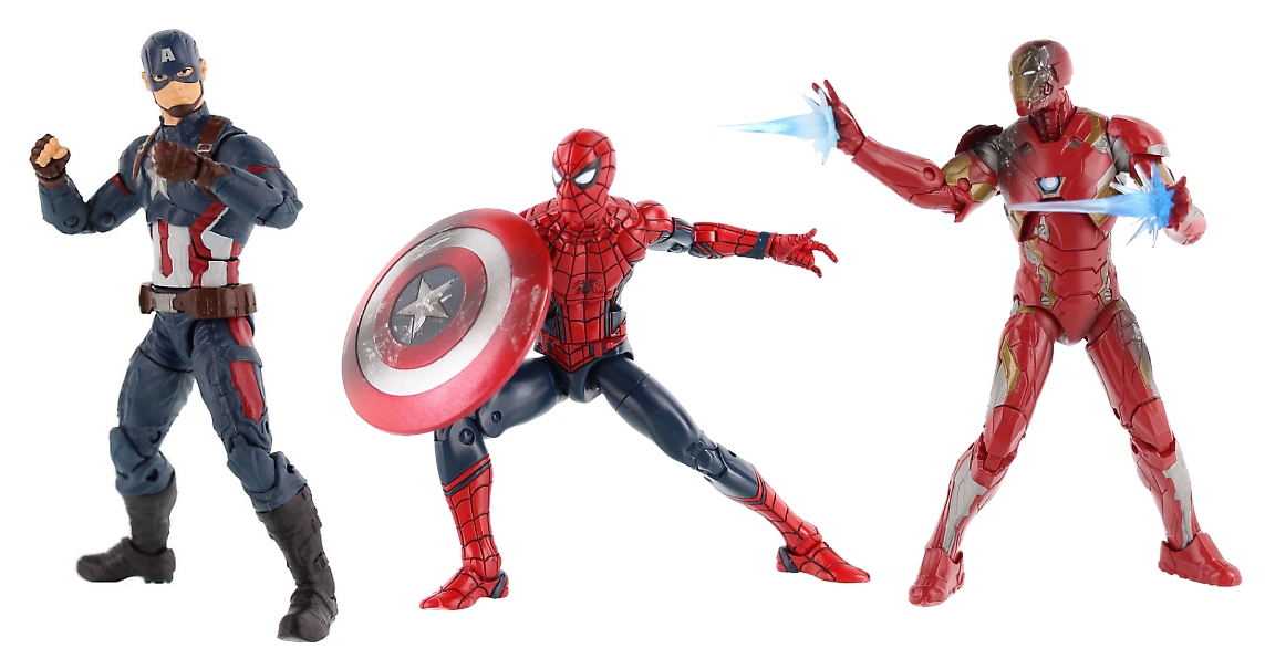 When the lines between right and wrong are blurred, which heroes will emerge victorious? Fans can collect their favorite heroes from the highly anticipated new film MARVEL’S CAPTAIN AMERICA: CIVIL WAR with this super trio of CAPTAIN AMERICA, IRON MAN, and SPIDER-MAN figures. Each figure comes equipped with iconic accessories inspired by the movie, such as CAPTAIN AMERICA’s shield and IRON MAN’s repulsor blasts. Figures come in an impressive 6-inch scale and feature premium articulation and detailed sculpting and deco. Includes three MARVEL LEGENDS figures, six accessories, and one shield. Available at most major retailers and on HasbroToyShop.com.