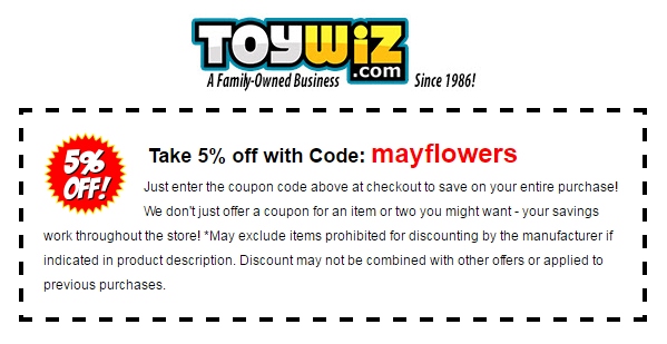 ToyWiz.com has thousands of in-stock items. Use the coupon code MAYFLOWERS and receive 5% off your purchase! Shop from an incredible selection of the newest and most popular action figures, toys, and collectibles including: