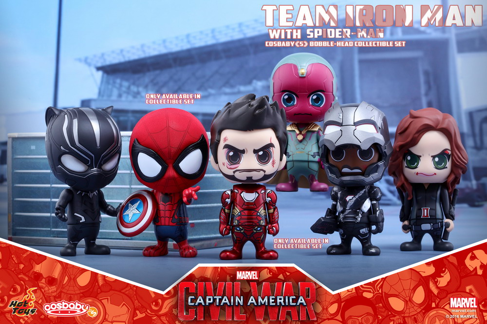To celebrate the debut of this exciting blockbuster, Hot Toys presents a special Team Iron Man Cosbaby Bobble-Head Collectible Cet featuring Spider-Man with Captain America’s shield, Tony Stark in Mark XLVI armor, James Rhodes in battle damaged War Machine Mark III armor, Black Widow, Black Panther, and Vision!