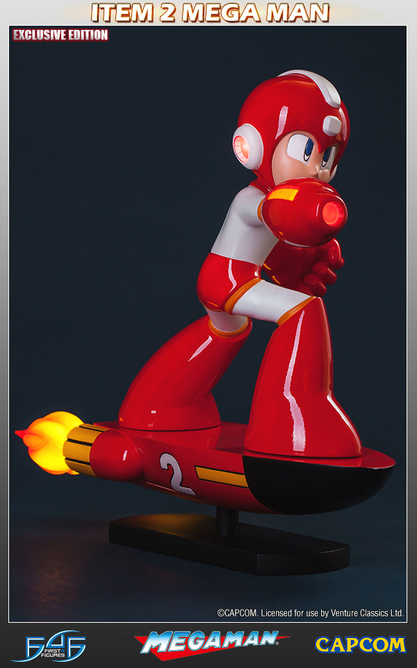 The standard edition statue (pictured above left, $229.99) features Megaman in his alternate red and white color scheme and firing his Mega Blaster as he speeds away on the Item #2. Flames are errupting from the back of the device, as every detail from the original 8-bit sprite has been faithfully recreated and reimagined to deliver this incredible 13 inch resin statue. In the exclusive edition (above right, $269.99), LEDs illuminate the Mega Buster and jet flames to complete the dynamic image.