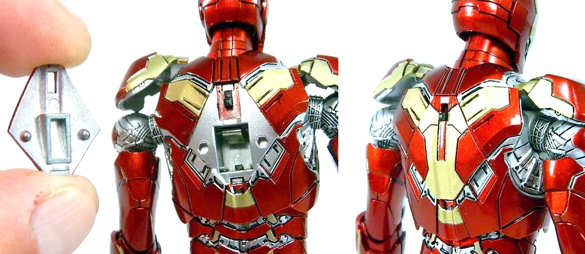 Included with the Iron Man Mark XLIII are 5 pairs of interchangeable hands, blast effects for the hands and feet, as well as forearm and shoulder missiles. Missing from previous releases is a display stand, an odd omission seeing how blast effects for Iron Man's feet are included. Still, it's understandable given the smaller packaging, and to be fair, it does reflect in the figure's lower price of $115 (as opposed to around $140). One omission I truly miss is being able to light-up the figure by simply flipping the switch on his back. I did this, but nothing happened. Investigating to see if it might be defective, I cracked open the battery compartment carefully concealed on the figure's back... only to find batteries are no longer included. The LED function - which lights up Iron Man's eyes and chest - requires 2 small button cell batteries (L626). This type of battery isn't that expensive, which makes their omission on a $100 collectible all the more baffling.
