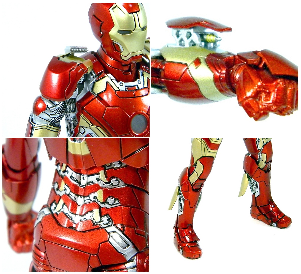 Thankfully, the figure itself made me forget all about the light-up feature. This is a thing of beauty. Constructed of 75% die-cast metal, the Iron Man Mark XLIII shines with a quality feel. It's appearance is also a head-turner, the figure featuring intricate sculpted detail and a shiny sports car-like paint scheme. This is indeed a Ferrari of 6-inch action figures. Comicave Studios has also made nice improvements with articulation. Not only do you receive 20+ points of articulation where it counts, the figure goes above and beyond with opening flight panels on the legs and shoulders! Even the armor plates on the interchangeable hands are articulated, however I did find swapping hands a bit troublesome because of it. The blast effect accessories plug in easy enough, though you'll need the corresponding plug hands for repulsor beam action to work. The micro missile launcher for the wrist installs by taking off the existing armor plate and inserting the accessory. Nice and easy. On the other hand, the micro missile launchers for the shoulders were a bit awkward to install. There are tiny holes to insert the weapons, however the shoulder armor tends to get in the way (or pop off entirely - making it easier to plug in the rockets, but a pain to pop back on the pads).