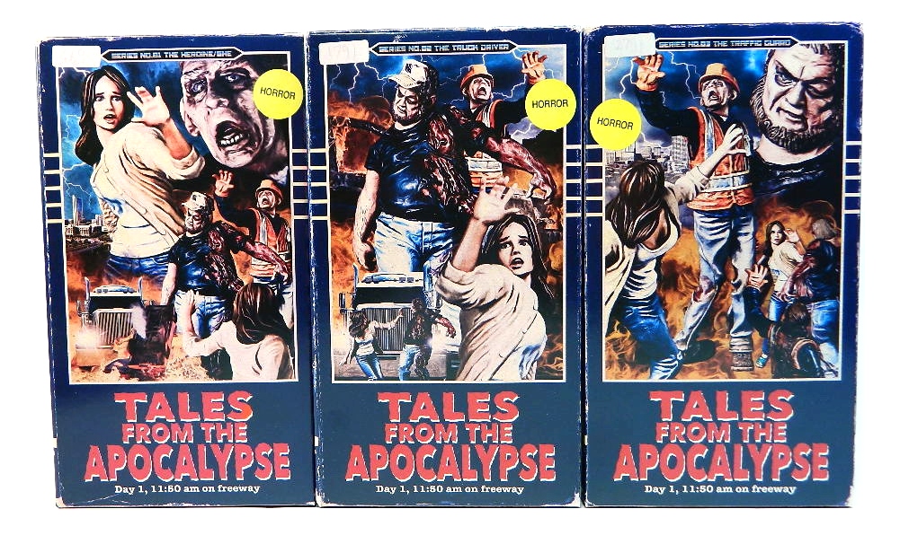 Tales from the Apocalypse Series 1 marks the beginning of the make-believe film: "Day 1, 11:50 am on freeway". The story unfolds with "Our heroine was suddenly thrown into the world of the living dead. Escaping from a zombie attack, she heads out of town, to save her little sister, Cindy." Character models in Series 1 are taken from this key moment in the movie and include the Heroine, the Truck Driver and the Traffic Guard. In case the unique box art didn't clue you in, each character is also written out at the top.