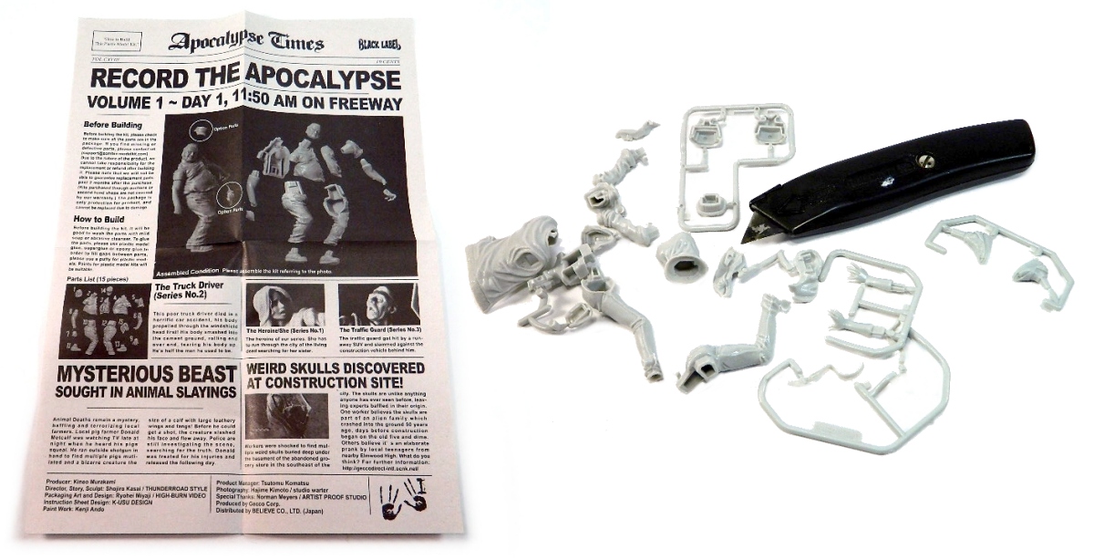 1/16th in scale, each model stands roughly 4 1/2 inches tall when completed. In true model kit fashion, each character comes in polybagged pieces - simply dump out the bag along with the instructions. Ah, the instructions! Just like the brilliant box design, Gecco went all out with the zombie lore on an instruction sheet that looks and feels like a newspaper. There are tips on how to prep and build your model, a brief description on the character and others in the series, along with awesome fake newspaper stories (!) and of course credit to those behind the project. Kudos to them all!