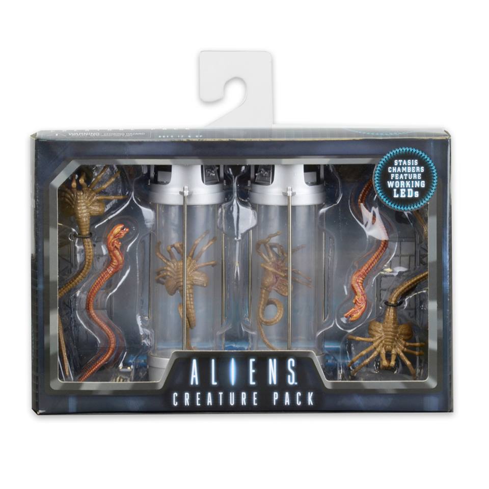 Set includes: 2 Stasis Chambers with LED Lights - Press a button to cast an eerie glow on the facehugger preserved within it! You can even fill the tube with water if you choose. Facehugger can also be removed from tube. Batteries included; 2 Chestbursters with bendable tails; 2 Facehuggers with bendable tails.