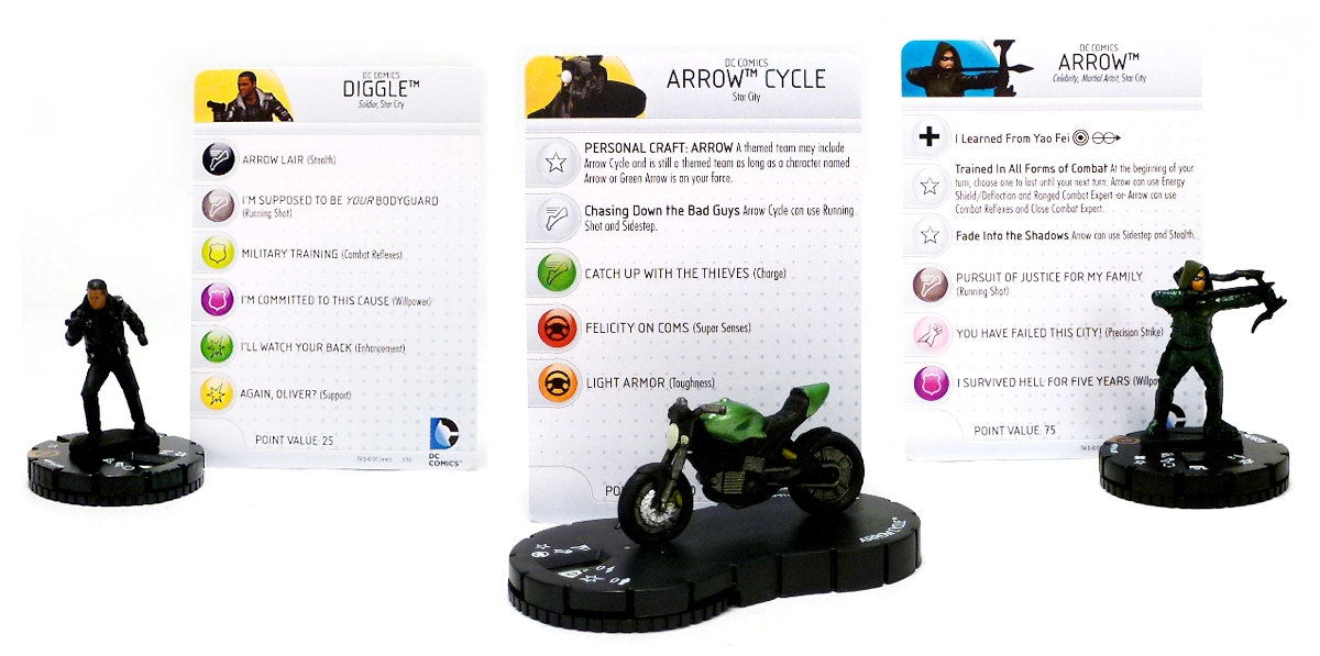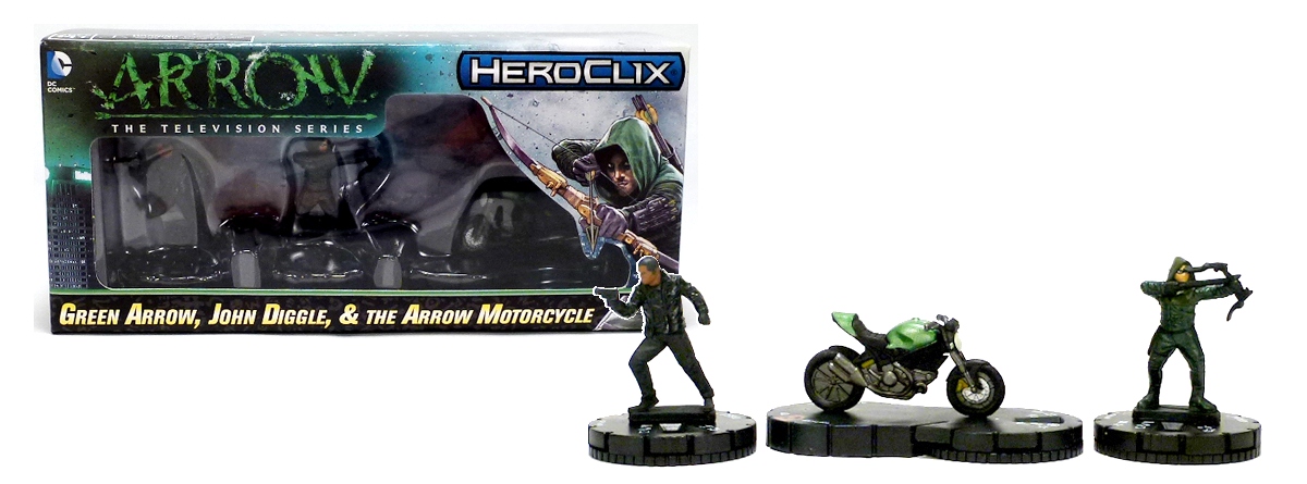 Diggle is another fan-favorite on the show, and he comes to HeroClix with a no-nonsense sculpt leaning into an attack with a pistol. Like Arrow his clothing is dark but has a lot of sculpted detail and he also has a very good face sculpt and paint job. John here is a street-level hero at 25 points with 5 range and two different power sets. He begins the game with Stealth, Combat Reflexes, and Enhancement and ends strong with Running Shot, Willpower, and Support. Get him into cover next to Oliver to boost the archer’s attacks and take his own pot-shots, and later get him into position to heal up his allies. Last in this pack is the Arrow Cycle, fully compatible with the recent updates to Vehicles in the game. The bike is built for speed and utility, a small vehicle with a fantastic sculpt and a paint job to match in metallic green, black, and muted metalwork. As usual with motorcycles in the game this one sits on a double base, and it comes into the game at 40 points with a Personal Craft trait letting it join theme teams that include an “Arrow” or “Green Arrow.” It’s highly mobile, starting with Running Shot and Sidestep before switching to Charge. Defensively there’s Super Senses and then end-dial Toughness. For fans of the Arrow TV show this pack is an absolute must-have as the figures look great and are highly playable.
