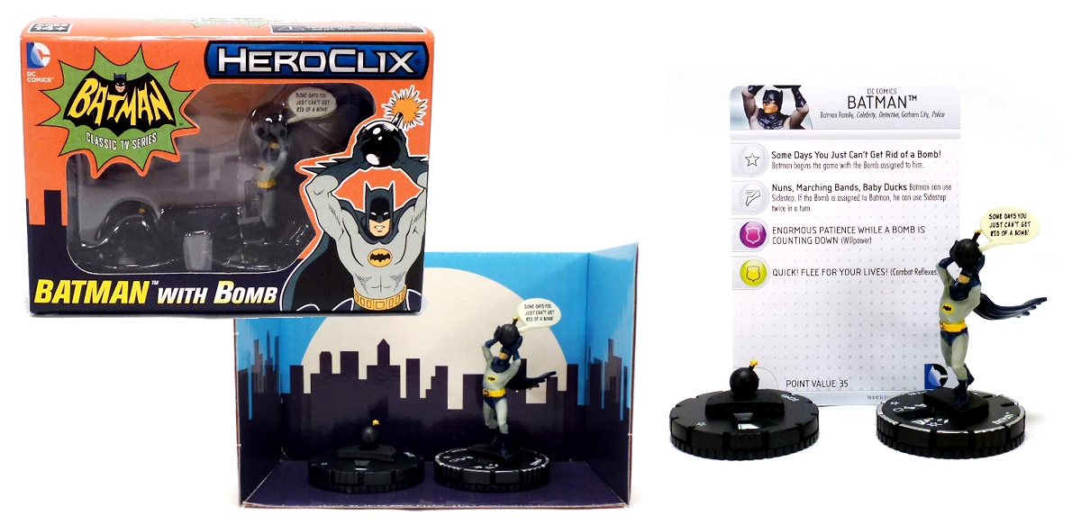 Going from smallest to biggest, first we have two different versions of 1966’s Adam West Batman. Known for his silly antics and crazy gadgets, this incarnation of the superhero fought criminals on TV and in a full-length feature film. WizKids has already produced one set of figures from the show as well as the Batmobile, and now these two exclusive Batmen immortalize iconic scenes from the show and movie. First up is Batman with Bomb ($15), straight out of Batman: the Movie and from a scene in which the hero runs through a comically crowded boardwalk looking to get rid of a huge cartoon-like bomb. The new figure perfectly captures Adam West as Batman running around holding the bomb above his head, and it even includes a built-in word bubble with the iconic line “some days, you just can’t get rid of a bomb!” Alongside Batman in the pack is a separate “Bomb” piece as well. For 35 points Batman has solid stats and a six-click dial with Sidestep (double when holding the Bomb!), Willpower, and Combat Reflexes. Batman starts the game holding the Bomb but can pass it off; anyone holding it can assign it to an adjacent character at the start of a turn (once per turn), and at the end of each turn the player whose figure is holding it has to roll a d6. A low roll means turning the Bomb dial, getting closer and closer to the “BOOM” which deals 3 damage to the figure holding it and all figures within 3 squares!