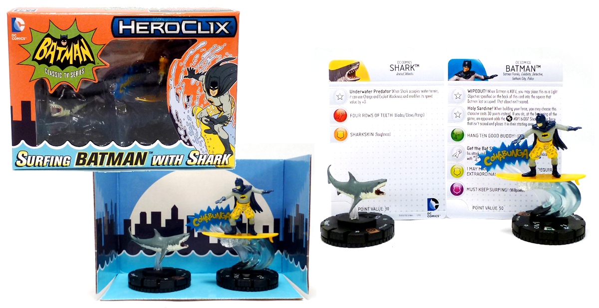 Next up is another (in)famous scene from the third season of 1966’s Batman, specifically the episode titled “Surf’s Up, Joker’s Under.” In it, Batman and his arch-enemy have a hilarious and ultra campy surfing contest. Notably, both characters wear surf shorts OVER their usual outfits (three piece suit and Batman costume) and the hero uses his patented Shark-Repellant Bat-Spray... which has already appeared in HeroClix as a convention exclusive Batbelt item a couple years ago. Surfing Batman ($15) hits the scene hanging ten with a sculpt that fits in perfectly with the first series of Batman ’66 figures. The hero wears his standard costume with the silly yellow shorts on top of it, standing on a bright yellow surfboard held aloft on a curling wave of translucent blue plastic. Meanwhile, there’s a big, bold, blue and yellow “Cowabunga!!” sign behind him. Batman and the sign are removable elements, which tie into the piece’s game mechanics. As with the “Bomb” pack this Batman comes with something extra, in this case a separate Shark figure! Batman is 50 points with the Swim symbol, a full dial of Charge and Close Combat Expert, starting Combat Reflexes and end-dial Willpower, and a starting Special Power that gives him a +1 attack boost against other Swimmers. When he’s KO’d you remove the figure and sign and the Surfboard becomes a light object; a figure can equip it to gain Improved Movement through Water terrain and +3 to movement while doing so! The Surfboard can also be played on its own as a 1 point special object. And then there’s the Shark! It’s a great-looking miniature and it’s a super fun attack piece at 30 points with Swim, full Blades/Claws/Fangs and Toughness, a trait giving it Charge, Exploit Weakness, and +3 speed in water, and the Atlantis keyword(!). There’s also a nifty option for Batman; you can play him at 50 points OR only 30 if you voluntarily give the Shark to your opponent’s team.