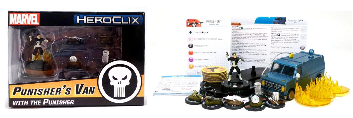 And then there’s the big daddy of the collection, and the one that’s got Marvel fans chomping at the bit to get in line... Punisher’s Van! The vigilante Frank Castle is back and this time he’s brought an entire armory, plus the cargo capacity to get it around town. This set ($50) comes with a huge amount of materials: the Van itself, a new Punisher figure, six 3D special objects, three Flame FX Bases, and eight Weapon object tokens. Frank appears in his classic black and white costume with the skull logo on his chest, and he’s ready to mete out vengeance as he dual-wields a pistol and submachine gun. By himself the Punisher is 60 points with Improved Targeting to shoot even while based and a 6 range with one target. He has good speed and defense, better attack numbers, and low damage but plenty of ways to boost it. Punisher starts with Sidestep, Willpower, and Ranged Combat Expert perfect for continuously moving closer to the enemy and blasting him. Mid-dial he switches to Stealth, Blades/Claws/Fangs, and Toughness, and late-dial picks up Combat Reflexes and Close Combat Expert. It’s a very dense dial with the ability to put out a lot of punishment, and mid-dial he’s deadly with the combo of Stealth, Blades, and Ranged Combat Expert.