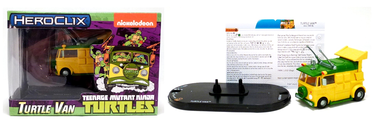 The Turtle Van sits on a 2x4 square base and can be played at either 100 or 60 points. Like the Arrow Cycle the Van does not break theme team for specific characters, in this case any of the Turtles; it can also carry characters with Battle Fury among its 4 total passengers. One trait gives it a decent range attack option, but it can be used only against flying or larger than standard figures. A second trait gives you options for activating the Pizza Time feature multiple times per turn (and more on that in a moment). On the Van’s dial you’ll good movement values with a smattering of Charge and Force Blast, and there are two instances of Telekinesis on the attack track. Defensively the vehicle has good numbers and great powers progressing from Invincible to Impervious, Invulnerability, and Toughness. Lastly there’s a four-click run of Empower near the top of the 100 point dial. Finally, there’s a second dial on the Van’s base, the Pizza Dial! Each turn you can give the vehicle a free action to pick friendly TMNT character, roll a d6, spin the dial that many clicks, and compare the color of the topping it displays with the chosen Turtle. If it matches (blue for Leonardo, red for Raphael, etc.) the character can heal 1 click or get a +1 to defense if it’s unharmed! And remember, the Van has a trait that lets you do more Pizza Time for power actions or double power actions. Overall the Turtle Van is fun to use without a lot of really complex powers and abilities, and the Pizza Dial gives it real in-universe appeal. Collectors and players are definitely going to want to hang onto this one as WizKids has already revealed that the 80s animated Turtles will be in a future HeroClix series.