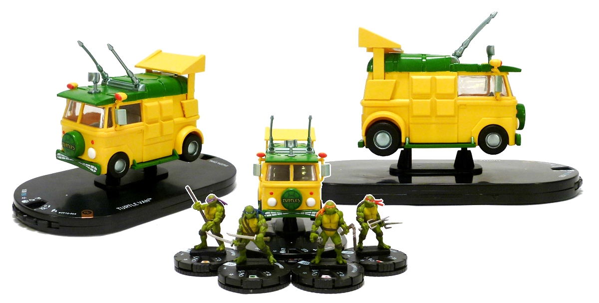 Also from television but a whole different universe is the Turtle Van ($30) from Teenage Mutant Ninja Turtles! The iconic vehicle first appeared in the 1987 animated series and became a toy (the Turtle Party Wagon) in 1989. A hit with fans from the beginning, the original Van would inspire future Turtle vehicles with its bright yellow and green paint scheme and silly gadgets. Just a few months ago WizKids released the first series of TMNT HeroClix figures (there’s more on the way), and the for-purchase Turtle Van joins alternate prize figure versions of Shredder and Casey Jones among this year’s convention exclusives. The Van closely replicates the look of the original cartoon vehicle with some unique design elements, and you can tell because WizKids included a pretty great image of it on the box. The vehicle is a boxy and short with smaller front wheels and larger back ones. The windshields and long side windows are transparent, and behind the latter are panels with raised square sections (segmented door armor), while the back of the van has (sealed) double doors. On top of the vehicle is a textured turtle shell-like armored roof equipped with Super-Spoiler, “almost useless roof guns,” antenna, and lights, and the front resembles a face with a frowny-face bumper and TMNT-branded spare tire “nose.”