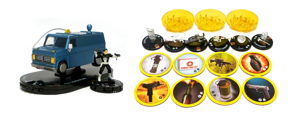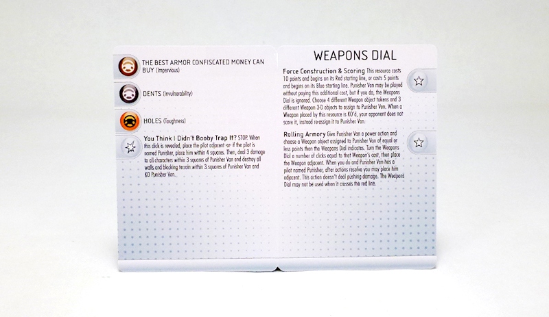 On the back of the Punisher Van’s base is the Weapons Dial, an options resource that be added to your game for either 10 or 5 points. If you do, before the game begins assign the Van four different Weapon object tokens and three different Weapon 3D objects. During the game for a power action you can place an onboard Weapon adjacent to the Van, and if the vehicle is being piloted by a character named Punisher you can also then place him adjacent to it. Which Weapons you can deploy is governed by the Weapons Dial, and each Weapon has a point value. Weapon objects and tokens range from 1 to 7 points, and they can be used on your starting force only if your team includes the Punisher Van or a figure named Punisher. Furthermore, only friendly characters can equip Punisher Weapons, and while it costs a power action to do it for most figures anyone named Punisher can do it for a free action! The Punisher’s Van set has an incredible amount of cool stuff going on with the vehicle, a great Punisher figure, and all of the fun Weapons. You’re definitely going to want one of these for your collection.