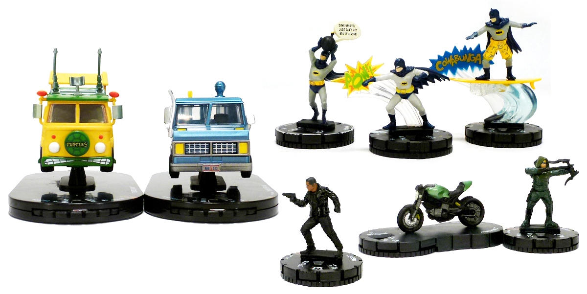 HeroClix special edition and promotional pieces share some general features when it comes to packaging. Their boxes are usually brightly colored affairs with lots of bold graphics, and the images alternate between renders or photos of the figures and comic book-style artwork. But while the single figure prize boxes are totally enclosed, the larger multi-item packs like the items at SDCC add a window as well so you can get a glimpse of the awesomeness inside! Of this bunch the Punisher’s Van packaging is (appropriately) the most dour, nearly solid black with just the renders and the fearsome Punisher skull logo in cracked white paint. Contrast that with the Turtle Van with its riotous background of comic images, bright colors, and bold artwork of the half-shelled heroes. The three DC boxes are really cool for their inclusion of art based on live-action TV characters; the Arrow images are intense while the Batman Classic TV Series packs are cartoony and fun versions of Adam West surfing and holding a bomb! There are even thematic cardboard background inserts in the smaller boxes that you could use for displaying the figures.