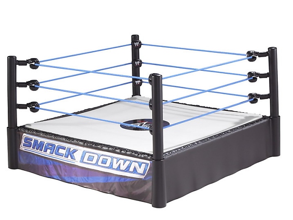 So, now you’ve got plenty of awesome WWE Superstars, but where do they wrestle? In Mattel's new line of WWE Superstar Rings, of course! Sharing the same components, the three Rings (RAW, SMACKDOWN, and ECW) are differentiated by colors and decos: the skirt running around the outside has the appropriate logo, and each Ring has different colored ropes. Mattel is including a lot of really fun features in these, making them great play sets. There's "ring action" (the springy give of the mat), taught ropes with firm corner posts that keep the tension thanks to Pro-Tension technology, and great authentic-looking turnbuckles that serve a second purpose in hiding the unsightly rope knots. The Basic Rings come in special "Try Me" packages through which you can feel the "Pro-Tension" technology of the mat. The WWE Superstar Rings will retail for $14.99.