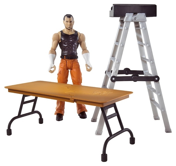 While the FlexForce guys are fun beating up on each other, their true potential is unlocked with the rest of the line. Also available will be figure and accessory packs that pair a WWE Superstar with a variety of his "tools of the trade" in the FlexForce Action Figure with Accessories assortment. Some of these include a huge speaker with stand (Undertaker), tables, ladders, ring steps (Matt Hardy), and more. The large items have sculpted base points from which the FlexForce figures can launch, jump, and smash!
