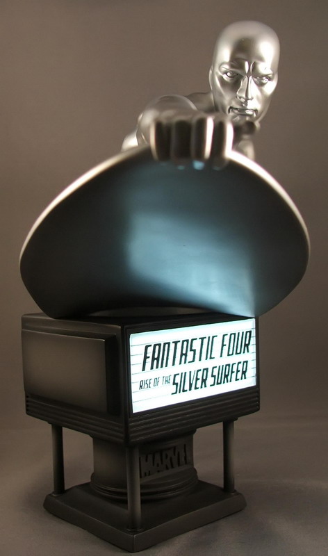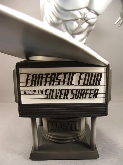 Because this is based off of the appearance of the character in the film Fantastic Four: Rise of the Silver Surfer, the base is designed to invoke the movie theater marquee. The logo for the film rests on the white sign and a small switch on the bottom of the base lights the sign and completes the movie theater marquee experience.