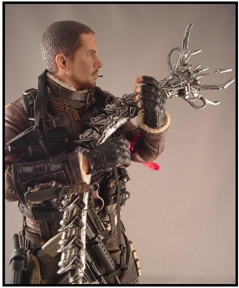The figure also includes a Tactical full body harness, Headset, Radio, six M4 magazine pouches and seven magazines (above), 2 Pistol Magazine pouches and three magazines, one shotgun magazine, four Demolition blocks, a Drop leg panel (above), a grappling hook and launcher, spring loaded pistol, M4 rifle with spring loaded shotgun attachment, and finally a wrist harness, knife and knife sheath...everything needed to whoop Sky-Net’s butt!