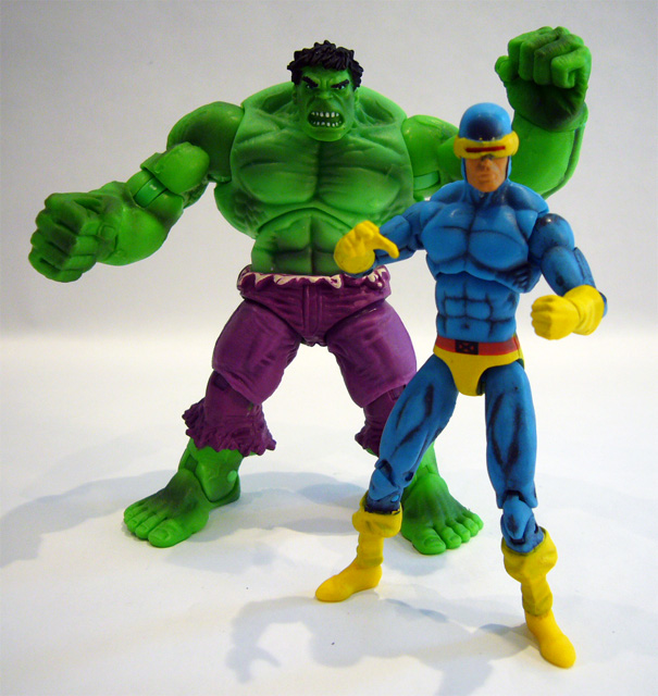 One of the first great “crossover” events in comic book history was the Marvel Secret Wars storyline. Originally a ploy to sell action figures, the series involved a strange alien abducting some of the most popular heroes and villains of the time to fight on a distant planet. Proving massively successful, Secret Wars is still remembered fondly today, 25 years later. Hasbro has turned that nostalgia into a great sub-line of the current 3 ¾ inch Marvel Universe figures, the Secret Wars Comic Packs. The first wave has been on toy shelves for a few months, and appearing now is the second wave which includes pack #4: Hulk & Cyclops!
