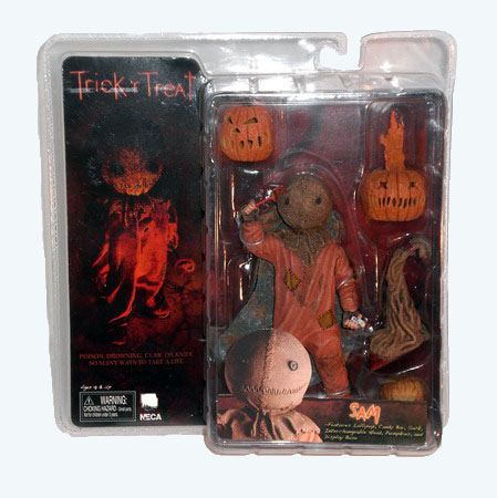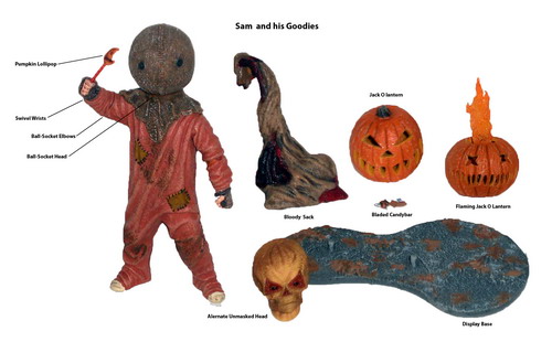 ARTICULATION/ACCESSORIES: Although this is not a highly poseable figure, Sam features a few articulated joints which permit some different posing alternatives for collectors. Perhaps the best thing about this figure is the plethora of cool accessories it includes. Aside from a decorative base covered in autumn leaves, this figure also includes 2 jack o’ lanterns, a bladed candy bar, bloody burlap sack and a bitten pumpkin lollipop. All of the pack in accessories are highly detailed and fit almost perfectly in Sam’s hands.