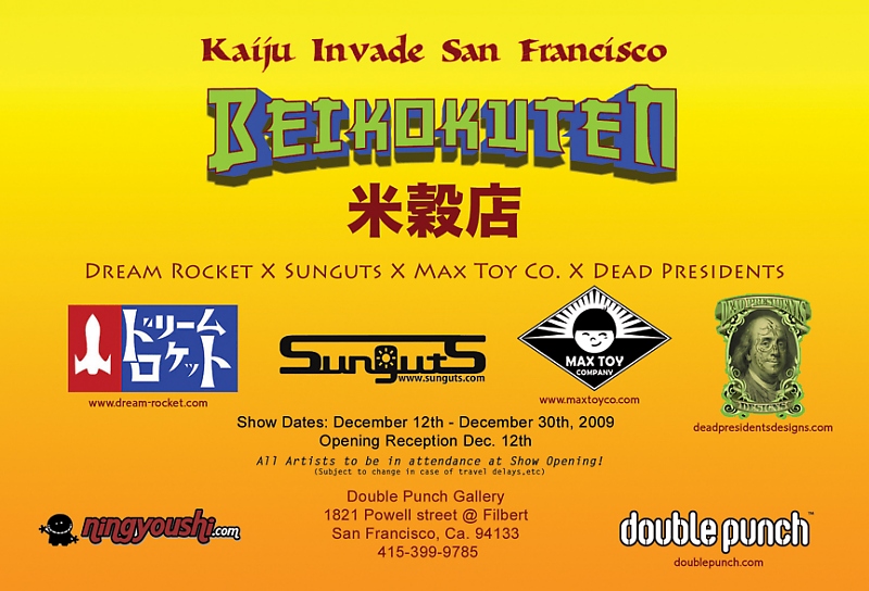 Coming up later this month, Kaiju takes over the Double Punch gallery space in San Francisco with four of the popular Kaiju toy makers and collaborators – SUNGUTS, MAX TOY COMPANY, DEAD PRESIDENTS, and DREAM ROCKETS. Yajima-san from Dream Rockets, Ichimiya-san from Sunguts, Matt Walker from Dead Presidents designs and Mark Nagata from Max Toy Company will be there in person with customs, originals, and 100% japanese goodness.