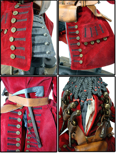 His costume is made from very fine materials, such as the cloth of his pants and shirt, the rough texture of his undercoat, and the soft velvet of his outer red coat. Each piece is sewn perfectly with no defects or loose threads. The coats have some nice details, with the black stitching and sculpted buttons. A leather belt with sculpted buckle and removable six-pistol holster that fits over his neck completes his outfit. The detailed pistols are all removable and each has a fully sculpted butt that features a demonic face. His left hand grips a longer pistol while his right wields a real metal sword with shell-shaped hand guard and wolf’s head hilt. The figure in this review, which is the Sideshow Exclusive version, also includes a removable axe that fits snugly in the back of his belt.