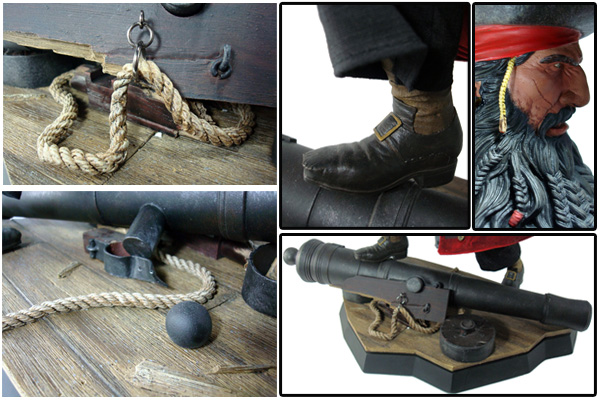 PAINT: The paint apps on Blackbeard do nothing buy accentuate the detail in the sculpt. Everything has been painted beautifully, especially the features of the face. His grizzled face is dirty and tan, his teeth are yellow and rotten looking (as are his fingernails), and his eyes and lip are wet. His hat, shoes, and belts have a brushed treatment that really gives the appearance of worn leather. The base has also been given a fantastic treatment with a finish to the cannon that makes it look like real metal and several color coats that give the deck a real wood-grain texture and appearance.
