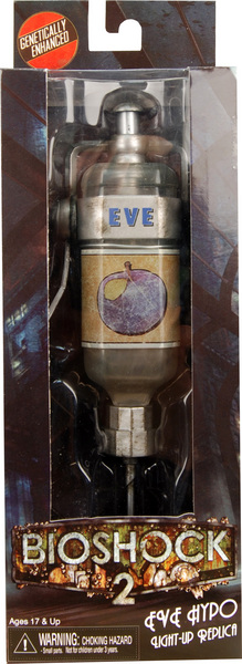 The second item we already revealed to you back in November: the EVE Hypo replica. The good news is this former UK exclusive is now available in the States. Full of the life blood of Rapture, the EVE hypo has LED lights that come on when you press the button at the top of the syringe. It measures over 8" tall and comes in window box packaging so you can see right away all the detail and weathering, just like in the game.