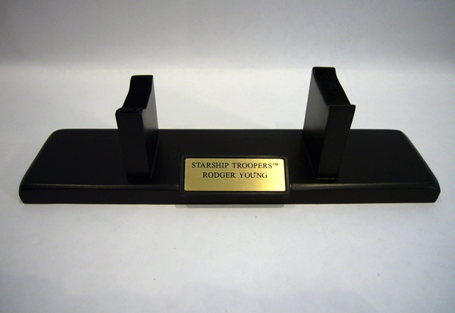 The Rodger Young comes packaged with a resin display stand. It's all black, with felt cradles for the ship sized to hold it level. Below the ship is a metal nameplate with the film and the ship's name (and edition number for non-samples), while the bottom of the base has the film's Tristar copyright information. Because the ship has such a convoluted surface including tiny metal "guns" around its midsection I highly recommend using the base and not putting down the Rodger Young on a flat surface.