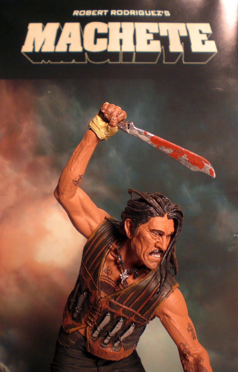 Ever since the Machete mock trailer was played during the intermission portion of the Grindhouse films in 2007, audiences have been eagerly awaiting a feature-length film of the cold-blooded Mexican anti-hero played by Danny Trejo. Three years later director Robert Rodriguez has fulfilled fans wishes with the recent theatrical release of the action-packed Mexploitation film and now fans can own their very own action figure of the blade-wielding Machete courtesy of NECA.