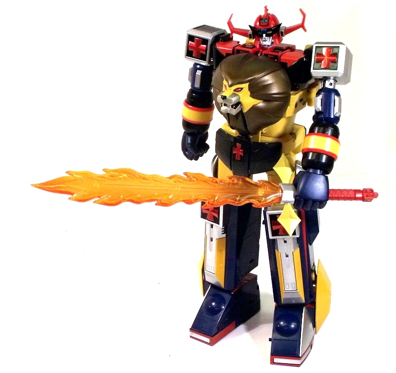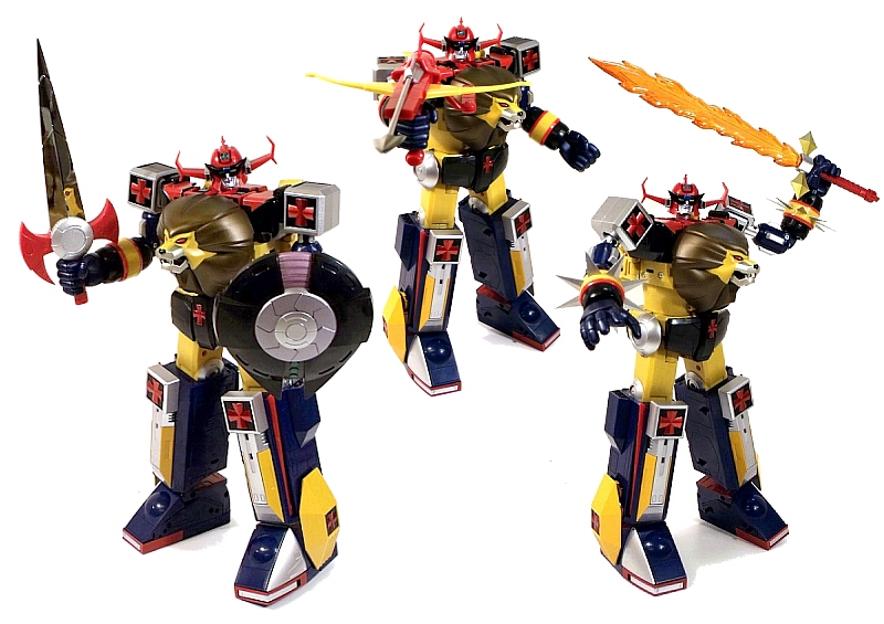 Finally we come to main attraction, the fully transformed Daltanious! Hasbro Transformer fanatics will absolutely have a blast converting the three modes into this towering toy. Transformation is not too challenging, but there is so much going on that it'll keep you raptly entertained. Morphing Atlaus is the initial step. Flip around his legs and fold them up around his chest, the latter which splits open wide to accommodate them. Atlaus' small head pops off as well, to be replaced with a much larger version (sans the removeable ship ability). Next, Beralios balls all up to form the torso. His head flips down to form the lion crest on Daltanious, the front legs compress and become part of Daltanious' back, while the lion's back legs stiffen out to become anchors for the main legs, Gunper.