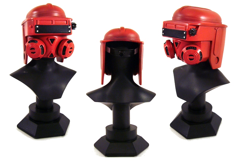 The Industrial Welding Mask is heavy duty protection for the most dangerous jobs. Instead of covering just the face it wraps around most of the head, only leaving a small part in the back exposed. The front is equipped with twin atmospheric filters on either side of the mouth area, and a heavy duty heat-shielded visor (with adjustment knob on the left). Add to that a bright fire engine red and black paint scheme and you’ve got a striking sci-fi prop.