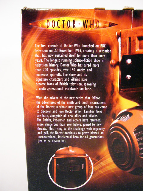 Weta’s miniature replica of the helmet comes to you in a very sleek box. Photos of the replica Welding Mask really pop over the black background and swirling red and yellow Doctor Who timestream patterns. The front panel is simple and sophisticated with a full frontal view of the helmet, its name in the bottom left corner, and logos for the show and Weta. One side panel shows the Mask’s profile, while the other has a close-up shot along with a description of the episode. The back of the box has an extreme close-up photo and rearview shot with a history of Doctor Who.